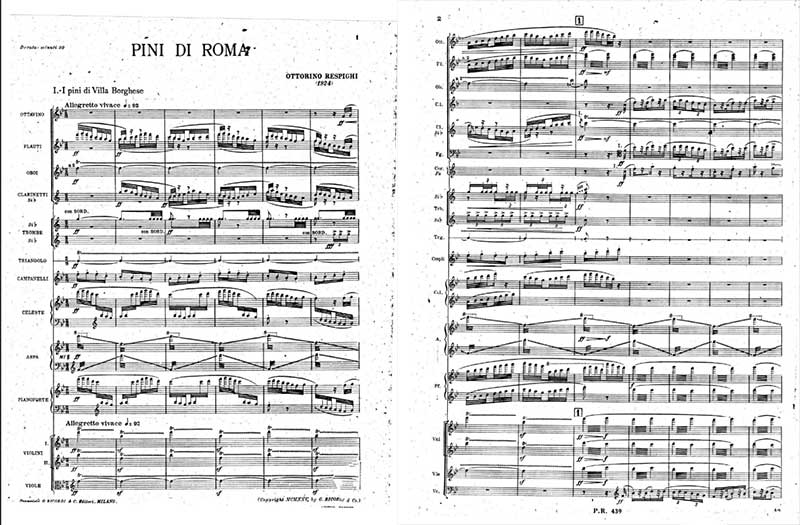 Najsłynniejsze dzieło Respighiego, Pinie rzymskie (I pini di Roma), powstało w 1924 roku i również składa się z czterech części wykonywanych attacca. Jest to utwór bardziej złożony pod względem dramaturgii i znacznie bogatszy instrumentacyjnie niż Fontanny rzymskie. Kolejne części ukazują różne miejsca Rzymu, w których rosną drzewa piniowe. Pinie w Villa Borghese to radosny obraz dzieci bawiących się w parku, z cytatami z włoskich piosenek dziecięcych. Pinie w pobliżu katakumb to surowa, mroczna muzyka z wykorzystaniem cytatów z chorału gregoriańskiego. Pinie na Janiculum to romantyczny nokturn, w którym odtwarzany jest z nagrania śpiew słowika – jest to pierwsze w historii muzyki połączenie wykonania na żywo z wcześniej zarejestrowanym dźwiękiem. Pinie przy Via Appia stanowią spektakularną kulminację – wizję triumfalnego marszu rzymskich legionów.