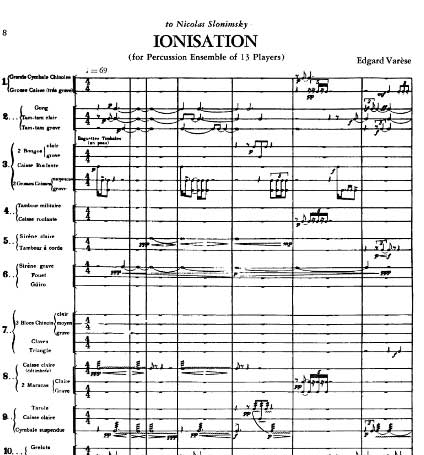 Najbardziej znana kompozycja Varèse’a to Ionisation na zespół 41 instrumentów perkusyjnych i 13 muzyków (1931) – pierwsza w historii muzyki samodzielna kompozycja na perkusję solo. Tytuł odwołuje się do zjawiska fizycznego (jonizacji), ale kompozytor odżegnywał się od skojarzeń z programowością. W utworze główny nacisk położony jest na brzmienie. Z instrumentów o określonej wysokości dźwięku w partyturze występują tylko dwie syreny alarmowe (charakterystyczne glissanda) oraz traktowany perkusyjnie fortepian, dzwony i czelesta. Pozostałe to instrumenty o nieokreślonej wysokości dźwięku, w tym wiele instrumentów egzotycznych z Ameryki Południowej.
