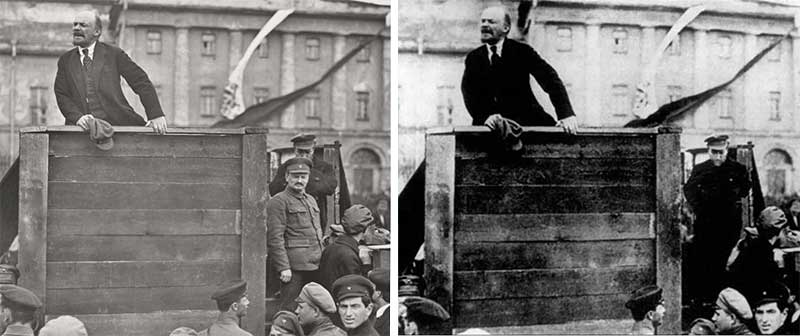 Ten sam los spotkał Lwa Trockiego, najpierw usuniętego z życia politycznego, a później z fotografii, w tym ze słynnej serii zdjęć Lenina przemawiającego na trybunie w 1920 r. W pierwotnej wersji na wszystkich ujęciach Trocki i Kamieniew stoją przy wejściu na mównicę, a w kolejnych „poprawianych” wariantach znikają kolejno, aż ostatecznie w oficjalnym obrocie pozostaje już tylko jeden z kadrów, z samotną sylwetką wodza rewolucji. Podobny los przypadł w udziale wielu ludziom zarówno ze środowisk opozycyjnych, jak i ze ścisłego kierownictwa NKWD.