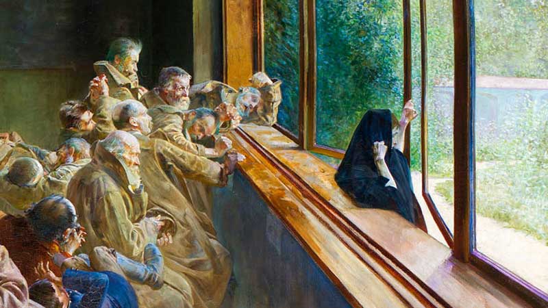 Tłum kieruje się w stronę rozświetlonego okna widniejącego po prawej stronie obrazu. Dzieci wymykające się z płótna artysty dorastają i starzeją się. Do okna docierają już jako zniedołężniałe jednostki, które nie są w stanie wyjść z pomieszczenia. Ta wizja to symbol zniewolonego polskiego narodu. Nie jest on w stanie wyrwać się z zaklętego kręgu, by sięgnąć wolności. Kolejne pokolenia umierają, poddając się dramatowi historii.