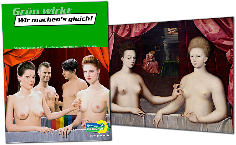 W 2002 r. niemiecka Partia Zielonych stworzyła plakat, który miał wyrażać poparcia dla małżeństw jednopłciowych. Na pierwszym planie ustawiono dwie nagie kobiety, z których jedna trzyma drugą za sutek. Plakat jest ewidentnym nawiązaniem do XVI-w. francuskiego obrazu przedstawiającego Gabrielę d’Estrées, faworytę króla Francji Henryka IV Burbona. Problem w tym, że towarzyszka Gabrieli z obrazu nie jest jej lesbijską miłością, a rodzoną siostrą. Co więcej – dotyk sutka nie oznacza fizycznej pieszczoty między kobietami, a wskazanie, że Gabriela jest w ciąży i już niedługo będzie karmić piersią nowonarodzone dziecko.