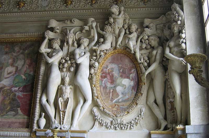 I oto na ścianach pałacu w Fontainebleau, a w konsekwencji w całej Francji, pojawiły się tworzone przez Włochów manierystyczne wizerunki o nienaturalnie wydłużonych kształtach, których powyginane linie odbiegają od statecznego ładu kompozycji Rafaela. Mężczyźni przedstawieni w skomplikowanych pozach skręcają swoje muskularne ciała w kilkuplanowych obrotach. Kobiety mają zbyt długie nogi, kształtne ramiona i niewielkie piersi. Bohaterowie pałacowych malowideł i stiuków są trochę zdeformowani, przedstawieni z lekką afektacją pozy, eleganccy, ale przede wszystkim – nadzy.