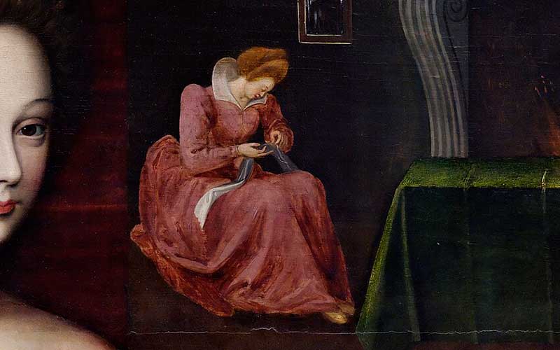 Jednak malarzom drugiej szkoły z Fontaineblau także zdarzały się dzieła, które u współczesnych widzów wciąż mogą wywołać lekkie zakłopotanie. Spójrzmy na obraz poniżej. Nie dość, że w wannie siedzą dwie nagie kobiety w pełnym makijażu i z wysokimi, starannymi fryzurami, to jeszcze jedna z nich szczypie sutek swojej towarzyszki. Dziwaczność tej sceny sprawia, że nawet nie zwracamy uwagi na to, jak bardzo niepoprawnie została namalowana lewa dłoń brunetki. Kiedy dzięki tytułowi dzieła zorientujemy się, że panie są siostrami, atmosfera robi się jeszcze gęstsza. I co właściwie oznacza niewielka postać szyjącej kobiety, jedynej w pełni ubranej osoby na obrazie? W najgłębszym planie nad kominkiem bystre oko dostrzeże bowiem w fragment wizerunku kolejnego nagusa. Nie znamy odpowiedzi na wszystkie pytania, ale sytuacja na obrazie na szczęście nie jest tak alarmująca, jak by się wydawało na pierwszy rzut oka.