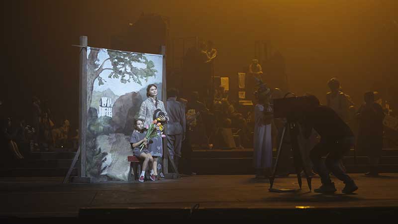 Brzmienie jest bogate, nasycone. Podczas próby prasowej instrumenty otoczyły w pewnym momencie publiczność, pojawiły się w tylnym i bocznych wejściach do sali (nie wiem, czy manewr powtórzono podczas premiery, bo siedziałam wtedy już na balkonie). Wybija się sekcja dęta. Wyeksponowany jest rytm, instrumenty naśladują odgłosy miasta, fabryk. Motoryczny stukot, metaliczne dźwięki wyobrażają proces budowy. Nie ma w tym jednak nic naiwnego, to prawdziwa sztuka. Kiedy trzeba bywa też poetycko i lirycznie. Niezwykle ujmująca jest chwila, gdy dziennikarce ukazują się duchy ofiar getta. Scena jest przełomowa dla tej postaci. Muzyka, która towarzyszy jej w tym momencie, jest utkana z resztek tego, co minione, stracone. To jak strzępy zniszczonej odzieży, w których jednak można rozpoznać dawną świetność, styl i formę. Ten fragment jest niezwykle poruszający.