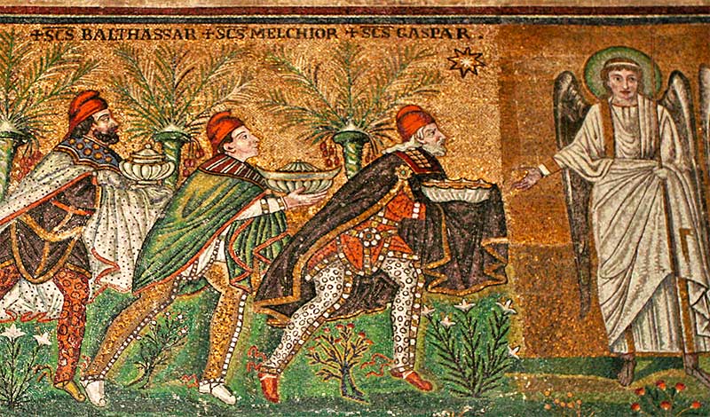 Ciekawym przykładem jest Mozaika „Pokłon Mędrców” znajdująca się w bazylice Sant’Apollinare Nuovo we włoskiej Rawennie, datowana na okolice 520 roku. Przybysze są już podpisani imionami, ale jeszcze ubrani w zwykłe spodnie, krótkie tuniki i czapki frygijskie – jak wędrowcy lub uczeni, a nie jak monarchowie. To kolejny, pośredni etap interpretacji ewangelicznej historii.